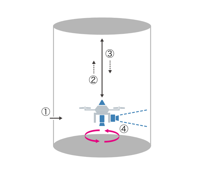 - ② ドローンは煙突内の円中央を保持し、一定の方位角を保ち、一定の範囲を撮影しながら自律飛行で上昇